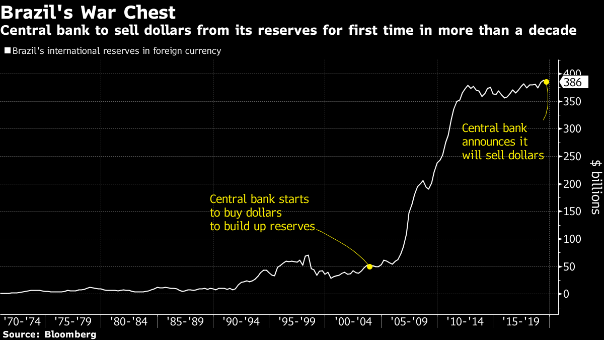 O ministro da Economia, Paulo Guedes, criou certa agitação no mercado no ano passado quando mencionou a ideia de usar as reservas para reduzir a dívida pública. Mas vender dólares no mercado de câmbio é visto como um movimento muito mais benigno.