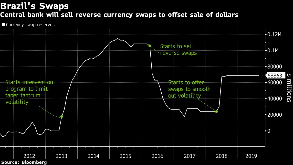 Na quarta-feira, a autoridade monetária informou que, além de vender dólares no mercado à vista, o BC também vai oferecer contratos de swap cambial reverso, o que equivale a comprar dólares no mercado futuro. A medida anula o impacto que a venda de dólares teria sobre o real, ao mesmo tempo que permite às autoridades aumentar a oferta local de dólares.