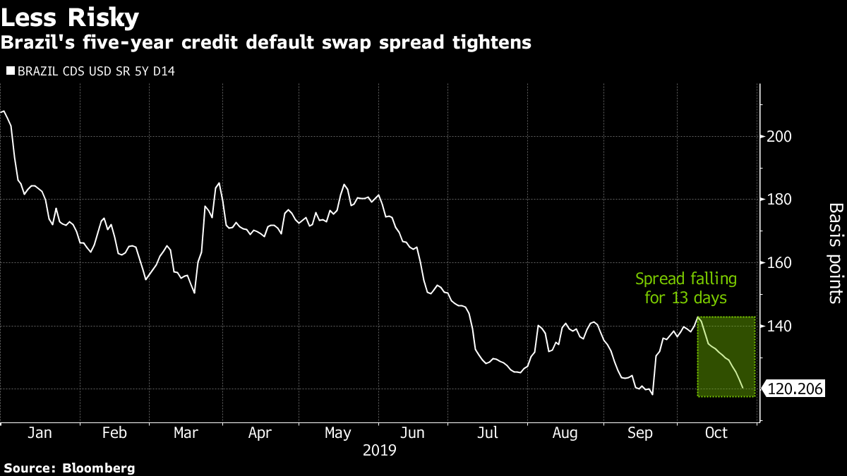 O custo de seguro de títulos soberanos do Brasil contra um default medido pelo CDS cai por 13 dias seguidos, o período mais prolongado desde 2004.
