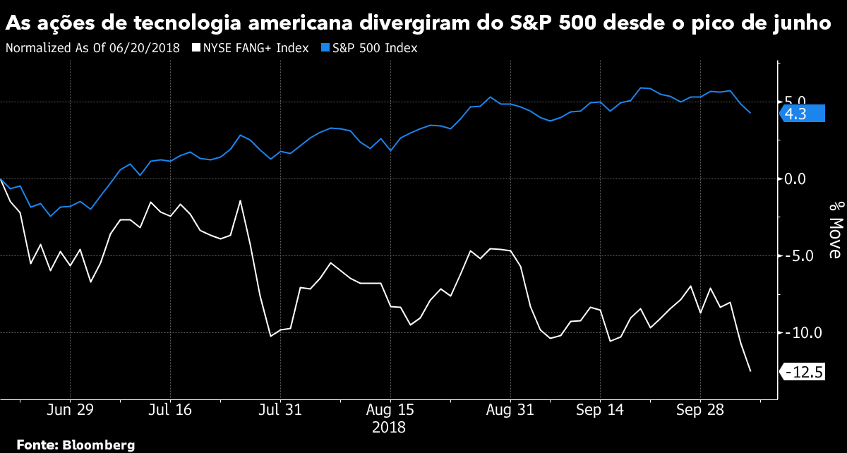 O S&P 500 bateu diversos recordes neste ano mesmo em meio a elevações de juros pelo Fed. Porém, o avanço é ameaçado pela alta dos rendimentos dos títulos do Tesouro americano e pelas potenciais consequências econômicas da guerra comercial entre EUA e China. O pico do NYSE FANG+ Index foi atingido em junho — três meses antes da máxima do mercado como um todo — e o índice caiu 13 por cento de lá para cá.