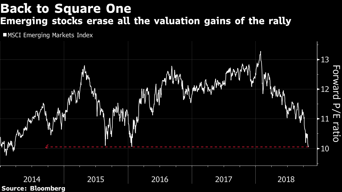O múltiplo do MSCI Emerging Markets Index desabou para níveis vistos antes de uma fase áurea que gerou US$ 8 trilhões em ganhos a partir de janeiro de 2016, de acordo com dados compilados pela Bloomberg. A razão entre preço e lucro estimado está pouco acima de 10 vezes, o P/L mais barato desde que a Rússia anexou a Crimeia.