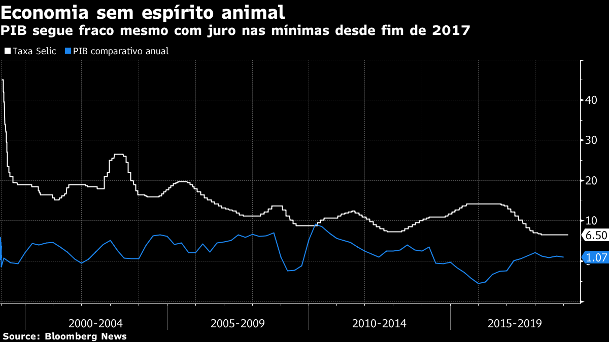 A taxa Selic, hoje em 6,5%, está em níveis historicamente baixos desde o final de 2017, mas neste período a expansão do PIB anual manteve-se perto de 1%. A economia mostra uma retomada muito lenta após a prolongada recessão de 2015 e 2016, num padrão diferente da rápida recuperação que se seguiu à crise do final de 2008. “O problema não é o juro. É a incerteza macro que está minando a economia”, disse Alberto Ramos, economista-chefe para América Latina do Goldman Sachs.