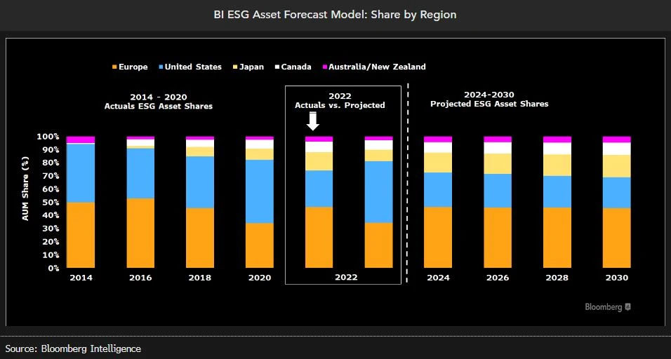Nossas projeções são baseadas no modelo de previsão de ativos ESG da BI, que combina decomposição de crescimento regional, tendências históricas e expectativas econômicas, apoiando-se em dados do relatório de 2022 da Global Sustainable Investment Alliance (GSIA), no qual uma mudança metodológica reduziu pela metade os ativos ESG dos EUA.