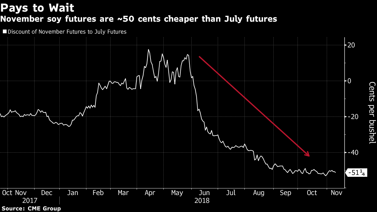 Para muitos agricultores americanos não há mais remédio a não ser ficar com a colheita. Milhões de bushels não têm para onde ir. Os terminais de Portland, um importante ponto de exportação para a China no litoral dos EUA no Pacífico, rara vez recebem lances. As provisões são armazenadas em terminais e elevadores, mesmo depois de o tempo frio e úmido de Dakota do Norte ter impossibilitado a colheita em muitas plantações. Os estoques de soja do país devem mais do que dobrar, para cerca de 955 milhões de bushels até o fim deste ano-safra, de acordo o Departamento de Agricultura dos EUA (USDA, na sigla em inglês).