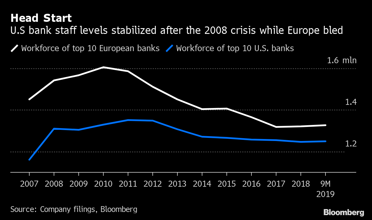 Os números deste ano também destacam o fraco desempenho dos bancos europeus, reflexo da economia orientada para a exportação da região que enfrenta disputas comerciais. Além disso, as taxas de juros negativas reduzem ainda mais a receita de empréstimos. Diferentemente dos EUA, onde os programas do governo e os juros em alta ajudaram os bancos a se recuperarem rapidamente após a crise financeira, as instituições na Europa ainda tentam uma retomada. Muitos fazem demissões e vendem ativos para aumentar a rentabilidade.