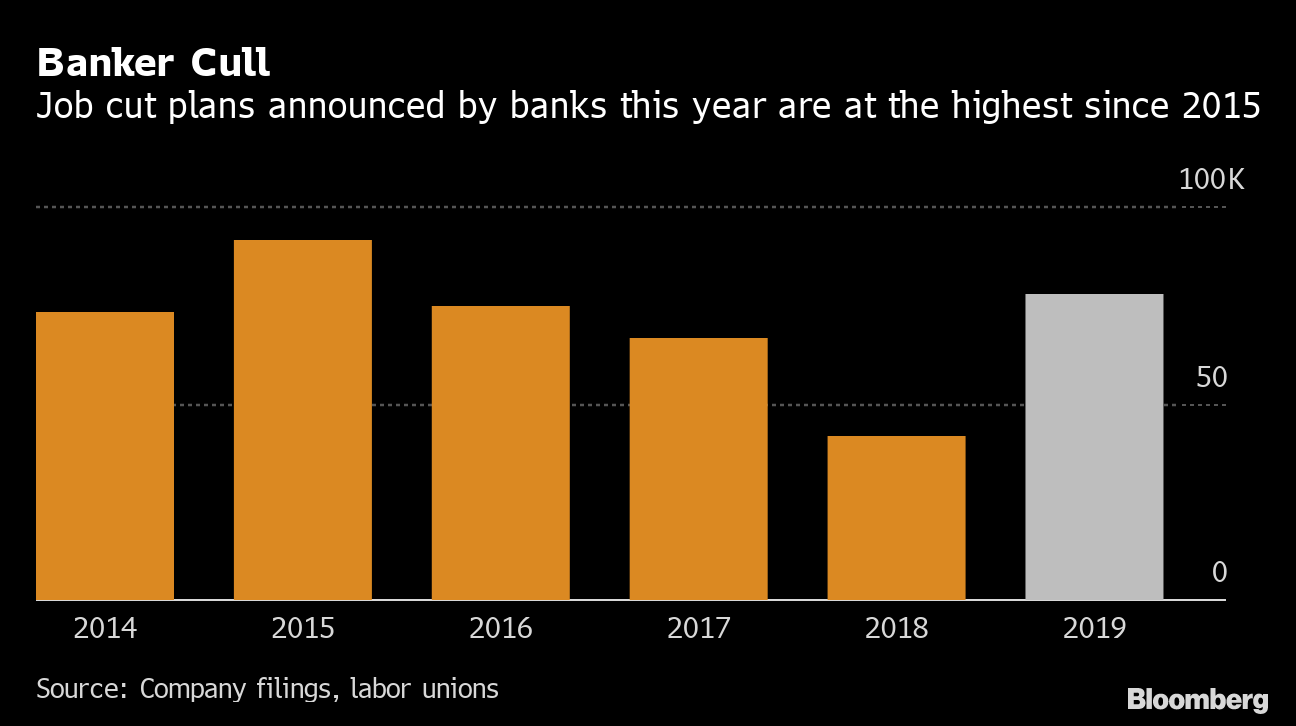 Bancos em todo o mundo fazem demissões no maior ritmo em quatro anos para reduzir custos em resposta a uma economia em desaceleração e adaptação à tecnologia digital.