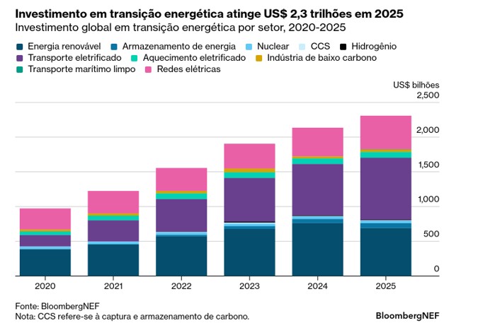 O relatório anual Energy Transition Investment Trends (ETIT) da BloombergNEF (BNEF) revelou que o investimento global em transição energética alcançou um novo recorde em 2025 de US$ 2,3 trilhões, alta de 8% em relação ao ano anterior. As principais componentes desse investimento foram transporte eletrificado (US$ 893 bilhões), energias renováveis (US$ 690 bilhões) e investimento em redes elétricas (US$ 419 bilhões). Apesar do crescimento no valor total, o investimento em energias renováveis caiu 9,5% na comparação anual, após introdução de incertezas por mudanças regulatórias no mercado de energia na China, o maior do mundo. Todos os demais setores acompanhados pela BNEF registraram aumento nos níveis de investimento, com exceção do hidrogênio (US$ 7,3 bilhões) e da energia nuclear (US$ 36 bilhões).
