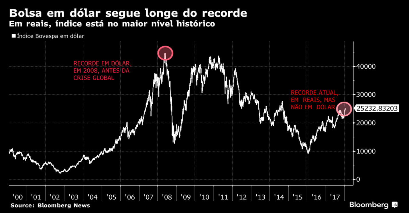 Spyer, da Mirae, considera que, para a bolsa voltar ao nível de 2008, quando o índice superou os 44.000 pontos em dólares, seria necessária uma combinação perfeita de notícias positivas em todos os campos, econômico, político e internacional. Ele lembra que quando a bolsa atingiu seu pico histórico, antes da crise global quase uma década atrás, o país vivia sob um “céu de brigadeiro”, uma situação diferente do quadro vivido hoje, apesar dos sinais de melhora da economia desde o ano passado.