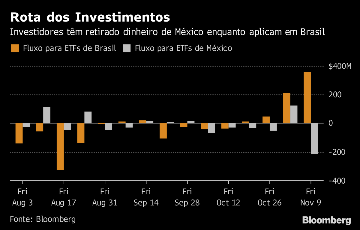 Ativos mexicanos têm ficado para trás de seus concorrentes desde que o novo presidente Andres Manuel Lopez Obrador desmantelou um projeto de um aeroporto parcialmente construído de US$ 13 bilhões, medida que foi seguida por uma proposta de seu partido de cortar as taxas bancárias. Mas Lopez Obrador pode não ser o único fator que está deixando os ativos mexicanos menos atraentes. O presidente eleito do Brasil, Jair Bolsonaro está conquistando investidores enquanto isso, com planos de vender empresas estatais, reformar a Previdência e reduzir o déficit fiscal, atraindo potencialmente fundos de outros mercados emergentes.