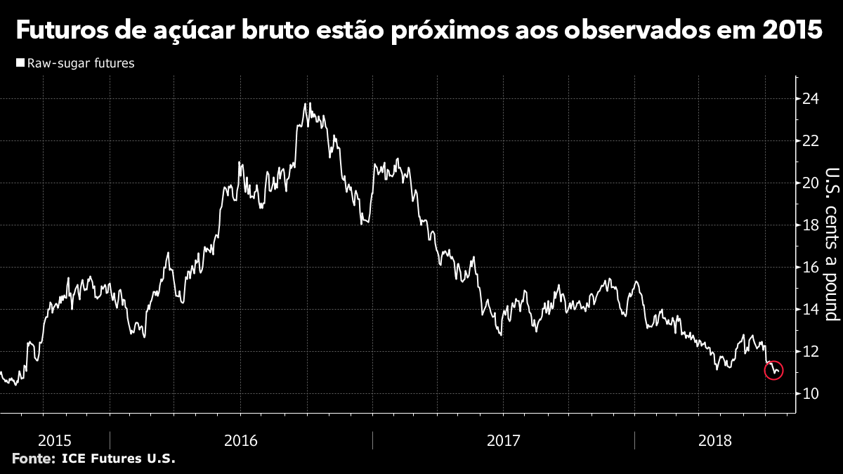 O açúcar apresenta um dos piores desempenhos do ano entre as principais commodities. Os contratos futuros do açúcar bruto caíram 27 por cento em Nova York devido ao excedente recorde desta temporada e à expectativa de oferta abundante novamente no ano que vem em meio à desaceleração do crescimento do consumo.