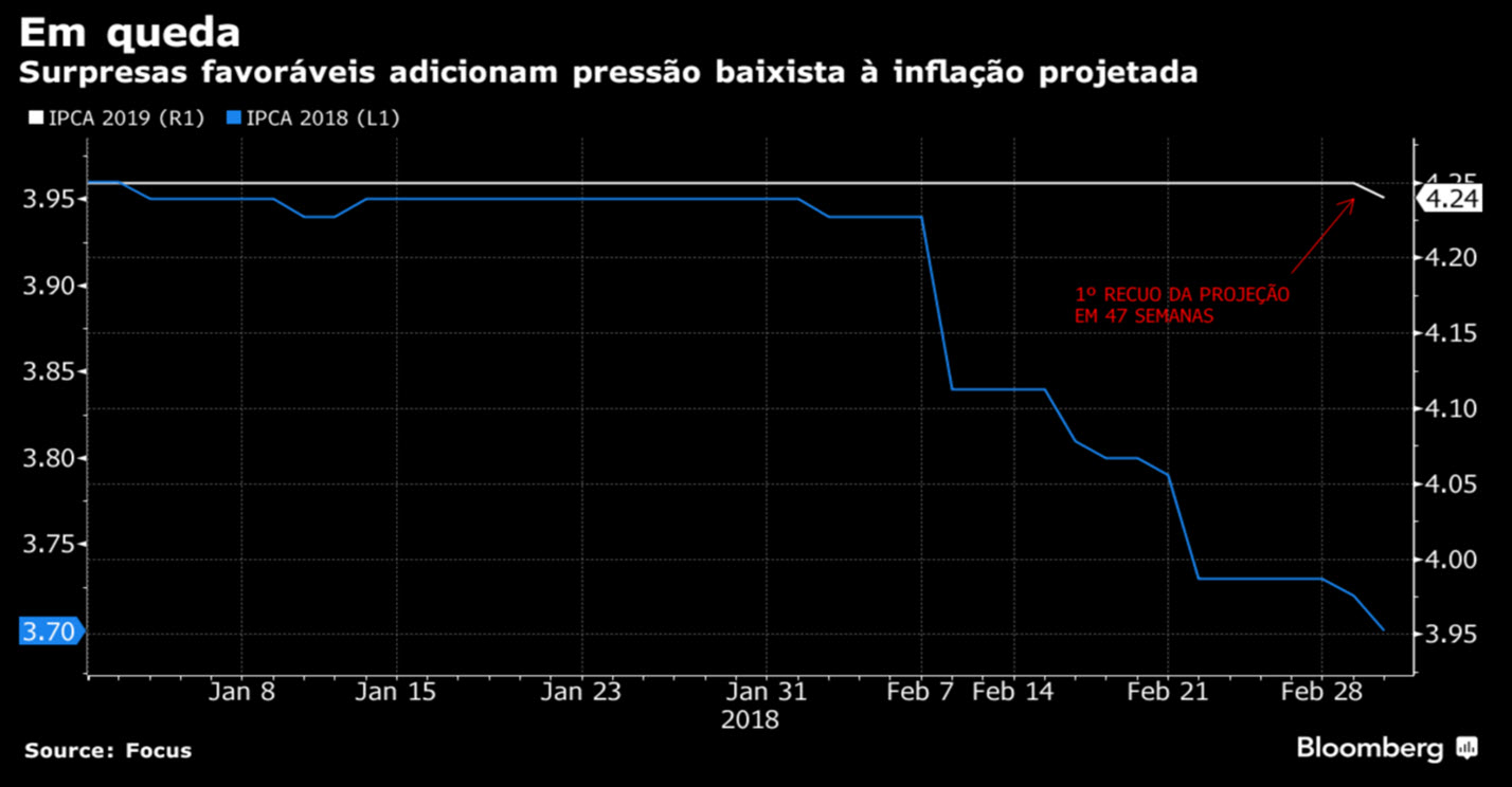 A inflação dá sinais de que pode encerrar 2018 mais perto de 3% do que de 4%, de acordo com a maior parte dos analistas consultados pela Bloomberg. As surpresas favoráveis do IPCA nos dois primeiros meses do ano, que pintaram um quadro de núcleos comportados e de recuperação abaixo do esperado dos preços de alimentos, levaram diversas casas a revisar as suas projeções para o número fechado do ano. O risco de a inflação ficar abaixo do piso da meta pelo 2º ano seguido aumentou, enquanto o viés baixista para a projeção de inflação de 2019 tem sido reforçado.