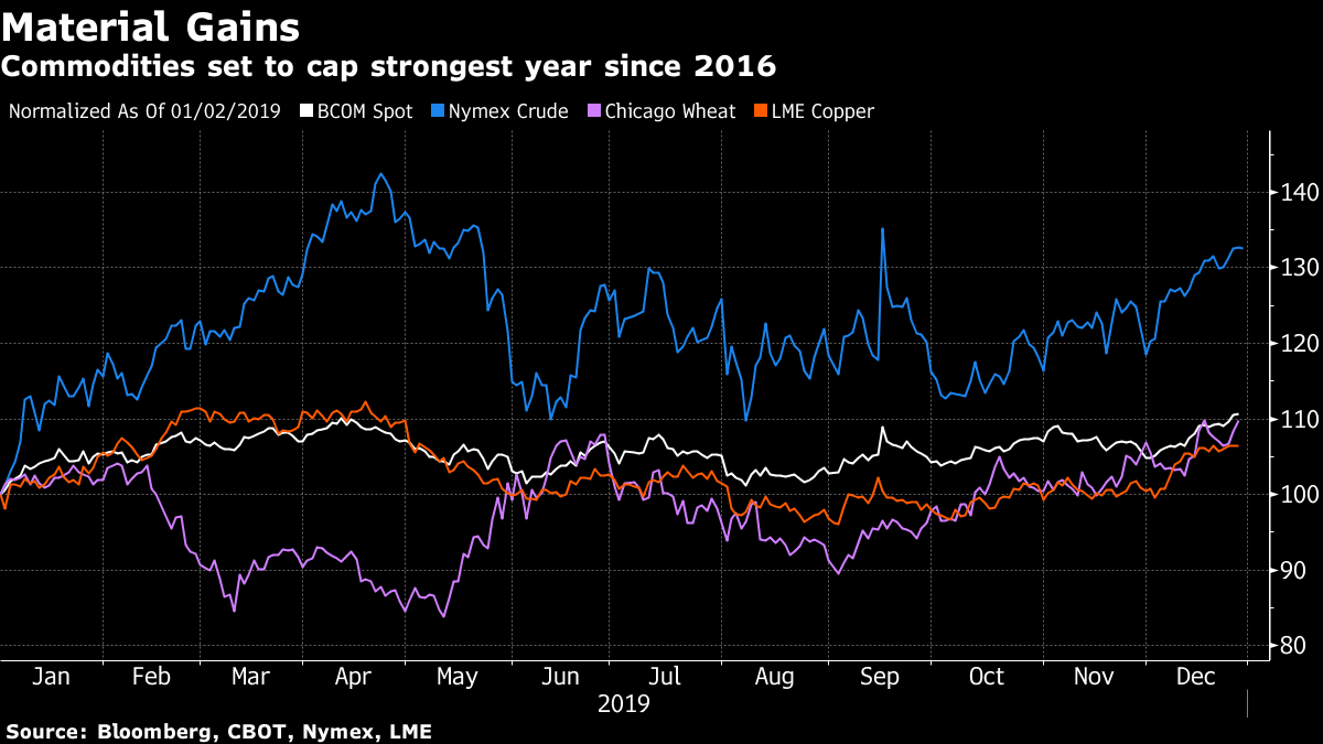 O índice Bloomberg Commodity Spot subiu para o nível mais alto desde novembro de 2018, impulsionado pelo alívio das tensões comerciais, maior apetite por risco e menor força do dólar. O indicador acumula alta de 11% em 2019, a caminho do melhor desempenho anual desde 2016.