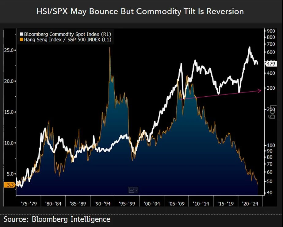 A menor relação entre o Índice Hang Seng (HSI) e o S&P 500 (SPX) desde 1975 no fim de janeiro pode indicar uma provável reversão e riscos de baixa nos preços de commodities. O índice Bloomberg Commodity Spot (BCOM), que atualmente está voltando ao seu pico de 2022, parece ter bons motivos para continuar essa tendência em 2024, dado o recuo da China. Espera-se que a relação HSI/SPX se recupere abruptamente de níveis tão baixos, mas nosso gráfico mostra o que pode indicar uma mudança de paradigma na ordem mundial com base na “amizade ilimitada” do presidente Xi Jinping com o presidente Vladimir Putin em 2022.
