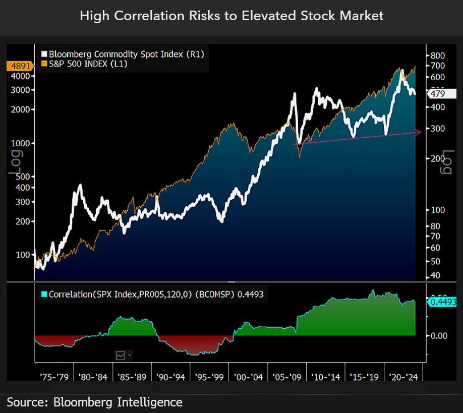 A necessidade de que as ações dos EUA carreguem tudo nas costas pode ser um fardo desproporcional. A correlação entre o BCOM e o SPX de 120 meses, em cerca de 0,45 em comparação com menos 0,10 no início do milênio, mostra os riscos de deflação em cascata se o mercado de ações dos EUA declinar.