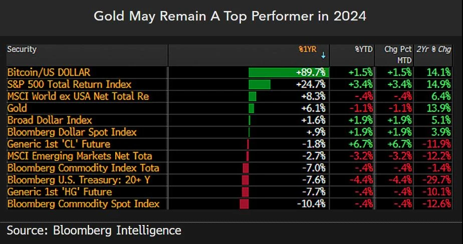 Chegamos cedo, mas acreditamos que o petróleo bruto WTI, o cobre e o milho devem retornar a pontos de apoio sustentáveis em torno de US$ 40 por barril, US$ 3 por libra e US$ 4 por bushel em 2024, na ausência de choques de oferta. Uma força primária para preços mais baixos pode surgir se o mercado de ações dos EUA parar de subir. Ouro: deve continuar a ter o melhor desempenho entre as commodities