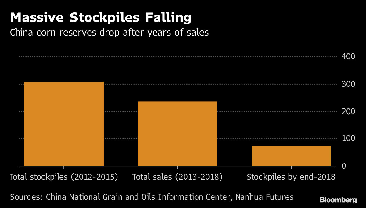 O país importou 757.000 toneladas de milho dos EUA em 2017. Zhang citou as expectativas do mercado de que a China poderia comprar 10 milhões de toneladas nos próximos anos depois que a reserva estatal vendeu 10 vezes esse montante em 2018 para atender à demanda crescente. O segundo maior usuário do mundo tem apenas 80 milhões de toneladas em seus estoques estatais, acumulados enquanto vigorou um sistema de apoio aos preços que foi cancelado em 2016, embora detenha também uma quantidade ignorada de reservas estratégicas.
