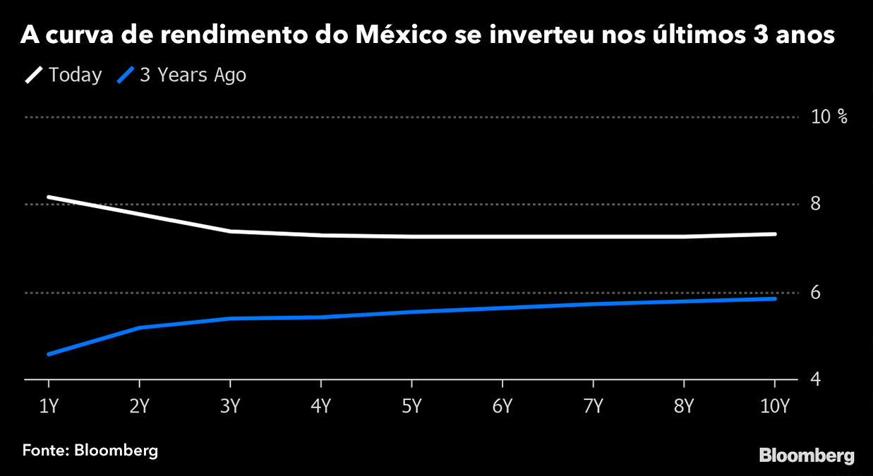 A evolução da curva de juros, que serve como um termômetro para o ativos do país, fica ainda mais clara quando se considera o México. Lá, a forma da curva segue a direção oposta, invertendo-se mais recentemente à medida que o prêmio de risco subia no curto prazo.