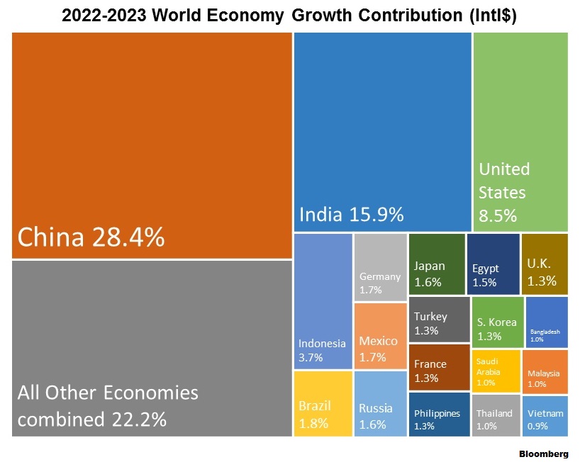 Os EUA deverão contribuir com uma parcela considerável do crescimento global, mas verão sua parcela diminuir com a propagação da democratização do crescimento do PIB. Em outras palavras, outros países terão uma fatia maior do bolo do PIB global. A participação dos EUA no crescimento global deverá cair de 12,9 por cento para 8,5 por cento em 2023.