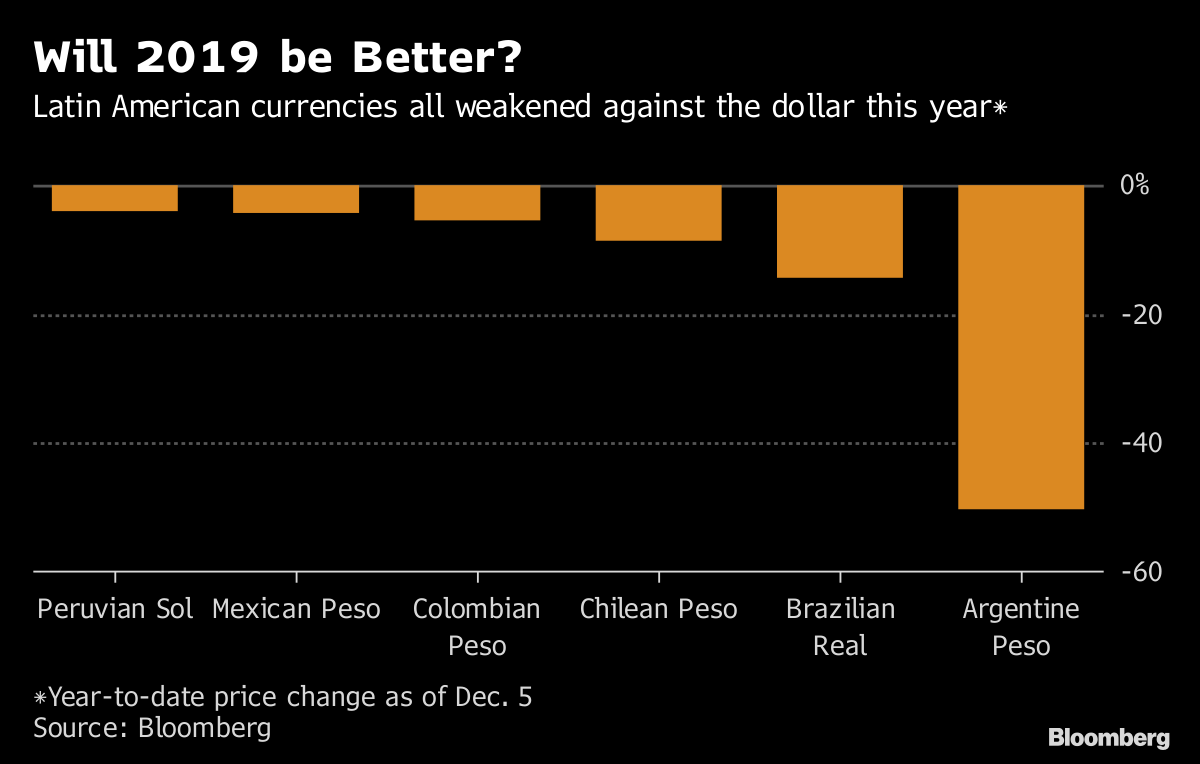 Ações e moedas da América Latina estão caminhando para o pior ano desde 2015, juntando-se a um selloff nos mercados emergentes, já que a preocupação com as perspectivas para o comércio global e a desaceleração econômica pesaram sobre o sentimento dos investidores. Enquanto a escalada das tensões comerciais ameaça aumentar ainda mais a volatilidade dos ativos de risco, as perspectivas de um dólar mais fraco e uma pausa no ciclo de aperto do Federal Reserve podem trazer alívio para os mercados locais. A questão-chave para 2019 continua sendo se os líderes regionais promoverão medidas para impulsionar o crescimento.