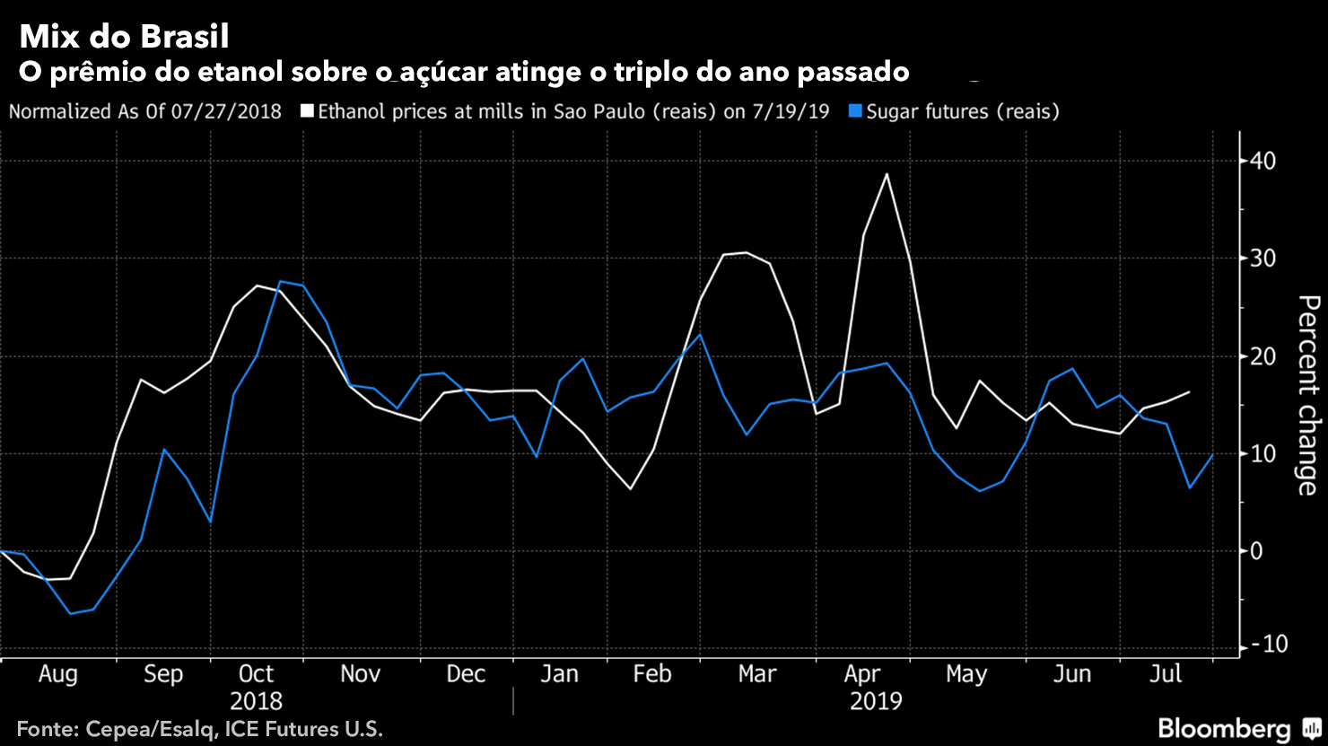Em 22 de julho, o prêmio do etanol hidratado alcançou 2,27 centavos de dólar por libra peso acima do açúcar bruto, em comparação com 0,56 c/lb um ano antes, de acordo com a Datagro.