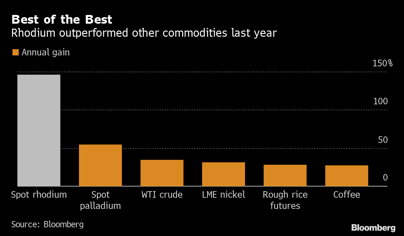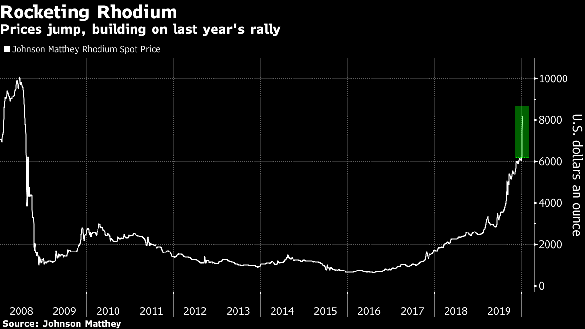 O ródio – usado principalmente em catalisadores automotivos e cinco vezes mais caro do que o ouro – acumula alta superior a 30% neste mês, atingindo o nível mais alto desde 2008. Regras mais rígidas de emissões impulsionam um rali que já dura vários anos, e há especulação de que investidores também apostam no metal com a perspectiva de que os preços caminham para um recorde.