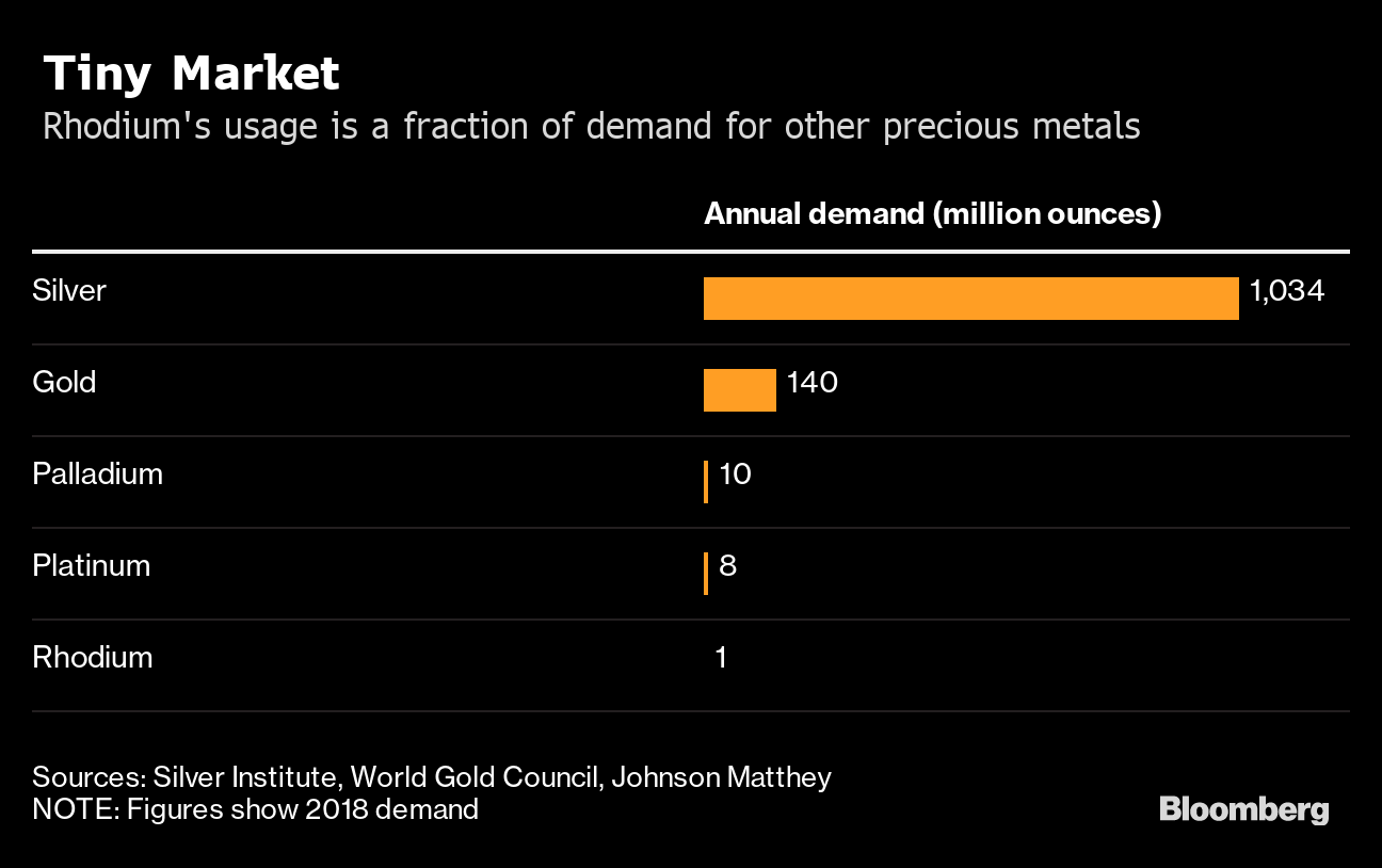 O preço do ródio multiplicou por 12 nos últimos quatro anos, com desempenho muito superior ao das principais commodities, puxado pela crescente demanda do setor automotivo. Como o paládio, o metal é extraído como subproduto da platina e do níquel, mas seu mercado é muito menor e, portanto, está sujeito a grandes oscilações de preços quando a oferta ou a demanda mudam de direção.