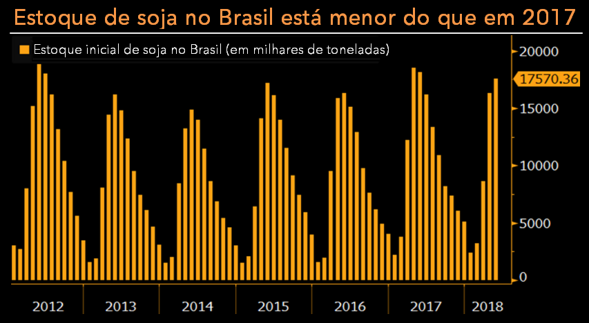 A redução dos estoques de soja no Brasil obriga a China a comprar mais dos EUA. O total comprado do Brasil pelos chineses já recuou de um pico de 1,35 milhão para 350 mil toneladas por semana. Só haverá oferta nova da América do Sul, inclusive da Argentina, a partir do primeiro trimestre de 2019. Embora os estoques de soja da China sejam elevados no momento, esse patamar será normalizado até outubro ou novembro.