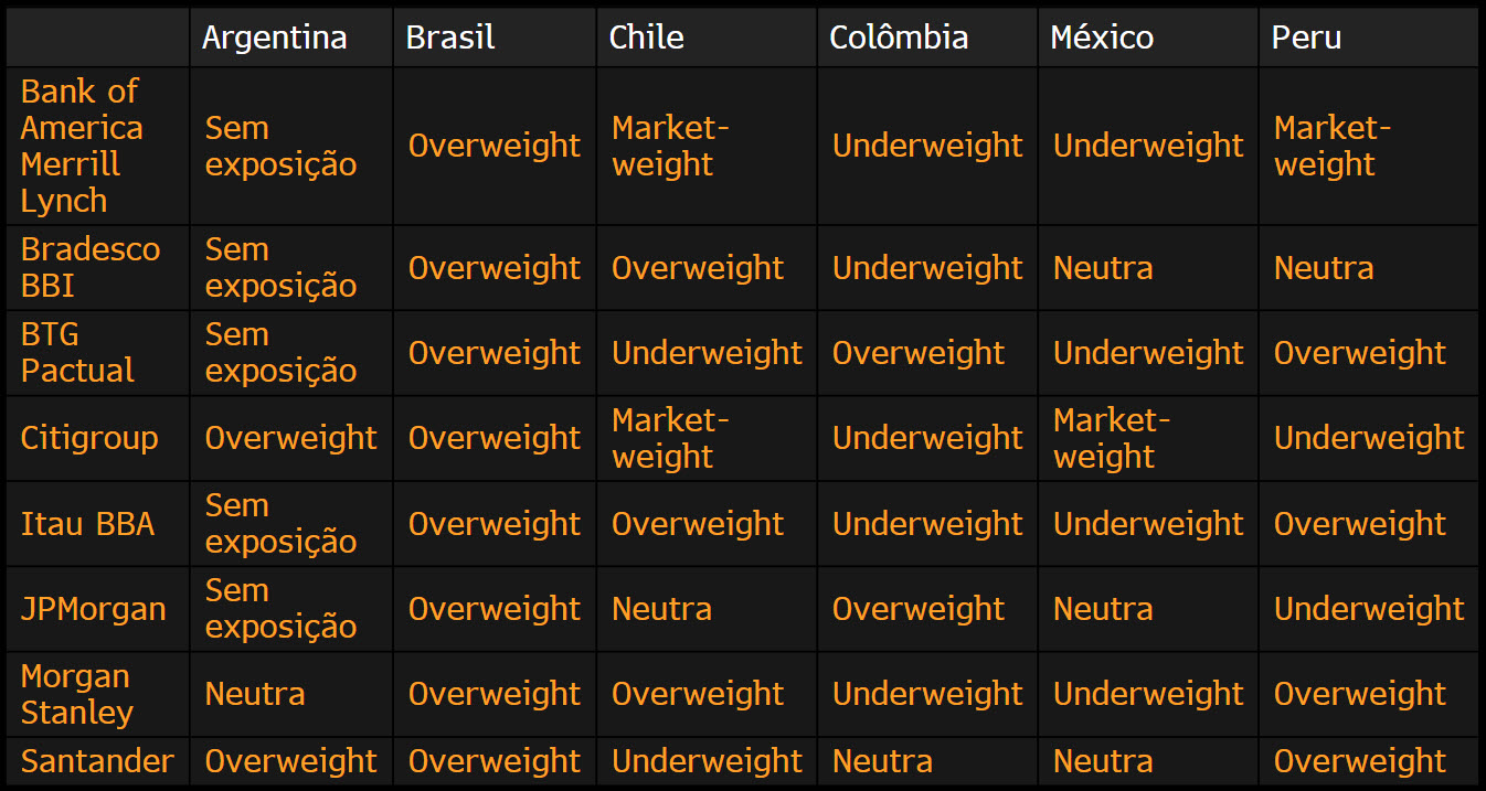 A Colômbia lidera o número de recomendações underweight, mas conta com uma visão positiva de BTG Pactual e JPMorgan. O desempenho da bolsa colombiana superou os pares latino-americanos neste ano – o índice Colcap subiu quase 23 por cento em dólar, ante ganho de cerca de 8 por cento para a região, segundo dados compilados pela Bloomberg.