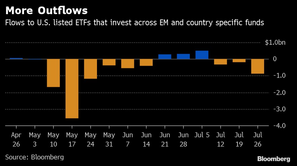 O ETF iShares Core MSCI Emerging Markets, que tem US$ 58,9 bilhões em ativos, conhecido como IEMG, registrou uma saída líquida de US$ 247,7 milhões na semana encerrada em 26 de julho, algo inédito para o fundo descrito pelos operadores como favorito dos investidores de varejo desde a sua criação em outubro de 2012. O saque ocorreu na mesma semana em que investidores retiraram US$ 885,7 milhões de fundos listados nos EUA que investem em países em desenvolvimento, mostram dados compilados pela Bloomberg.