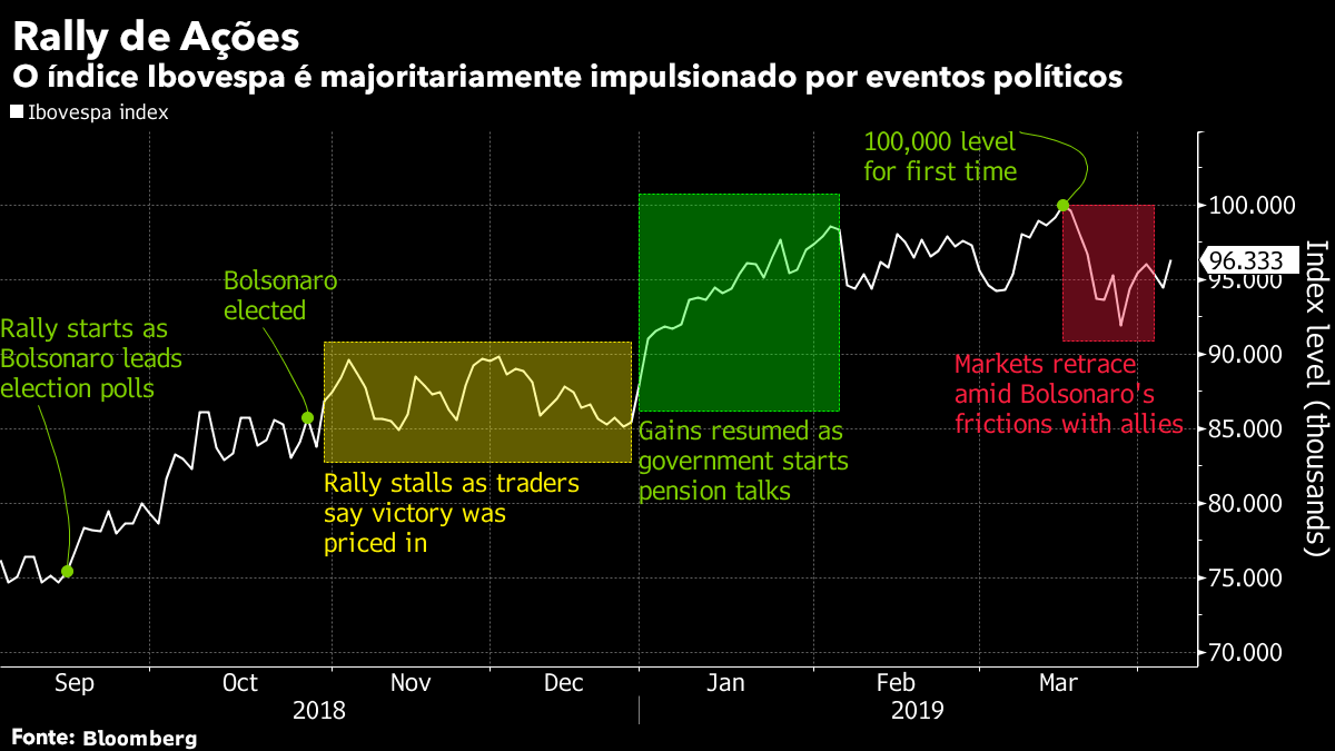 Os ativos locais têm subido sempre que os líderes do governo sinalizam apoio à reforma e despencam quando as notícias indicam um possível atraso. Esse foi o caso no mês passado, quando o mercado acionário e o real se desvalorizaram em meio às farpas trocadas entre o presidente Jair Bolsonaro e importantes aliados, como o presidente da Câmara dos Deputados, Rodrigo Maia, que, depois de dias de bate-boca, disse que deixaria a responsabilidade de conseguir votos para a reforma a cargo do governo. Um embate esta semana entre o ministro da Economia, Paulo Guedes, e parlamentares que terminou com ele sendo escoltado na saída de uma audiência em um comitê do Congresso depois de uma discussão acalorada teve o mesmo efeito.
