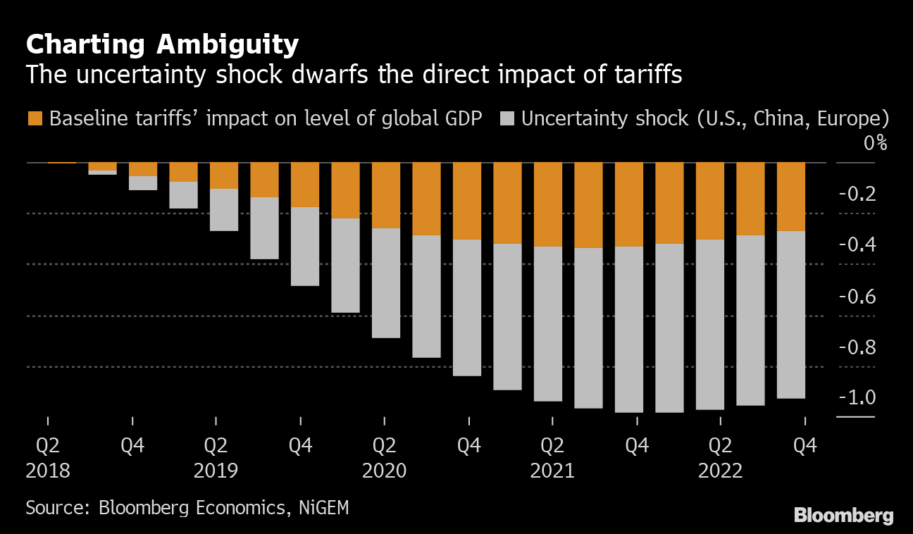 De acordo com um relatório da Bloomberg Economics, a incerteza sobre o comércio poderia reduzir o Produto Interno Bruto mundial em 0,6% em 2021, em relação a um cenário sem guerra comercial. Isso é o dobro do impacto direto das tarifas e o equivalente a US$ 585 bilhões do PIB mundial estimado pelo Fundo Monetário Internacional, de US$ 97 trilhões em 2021.