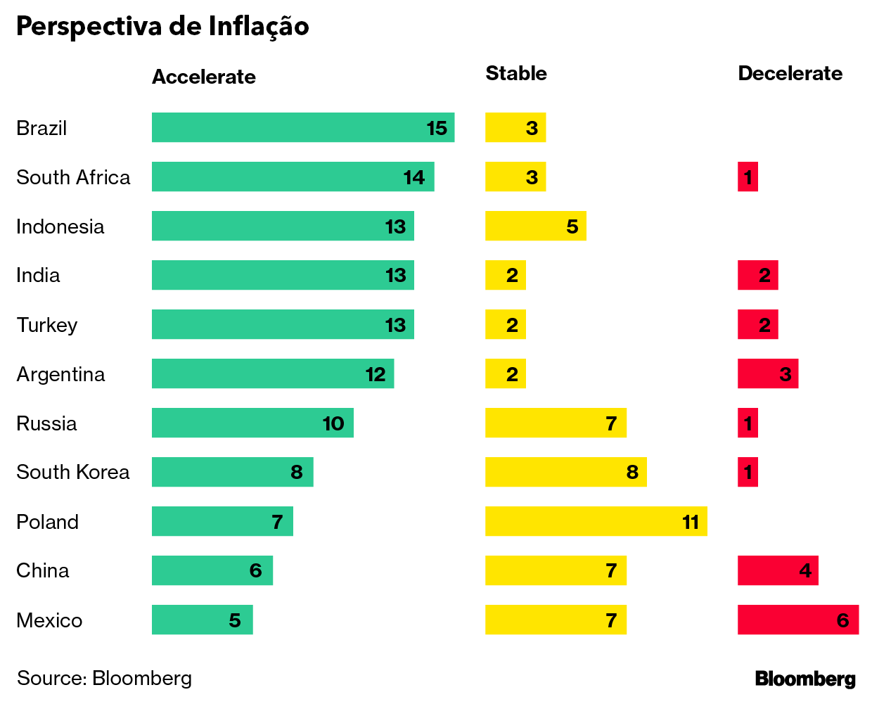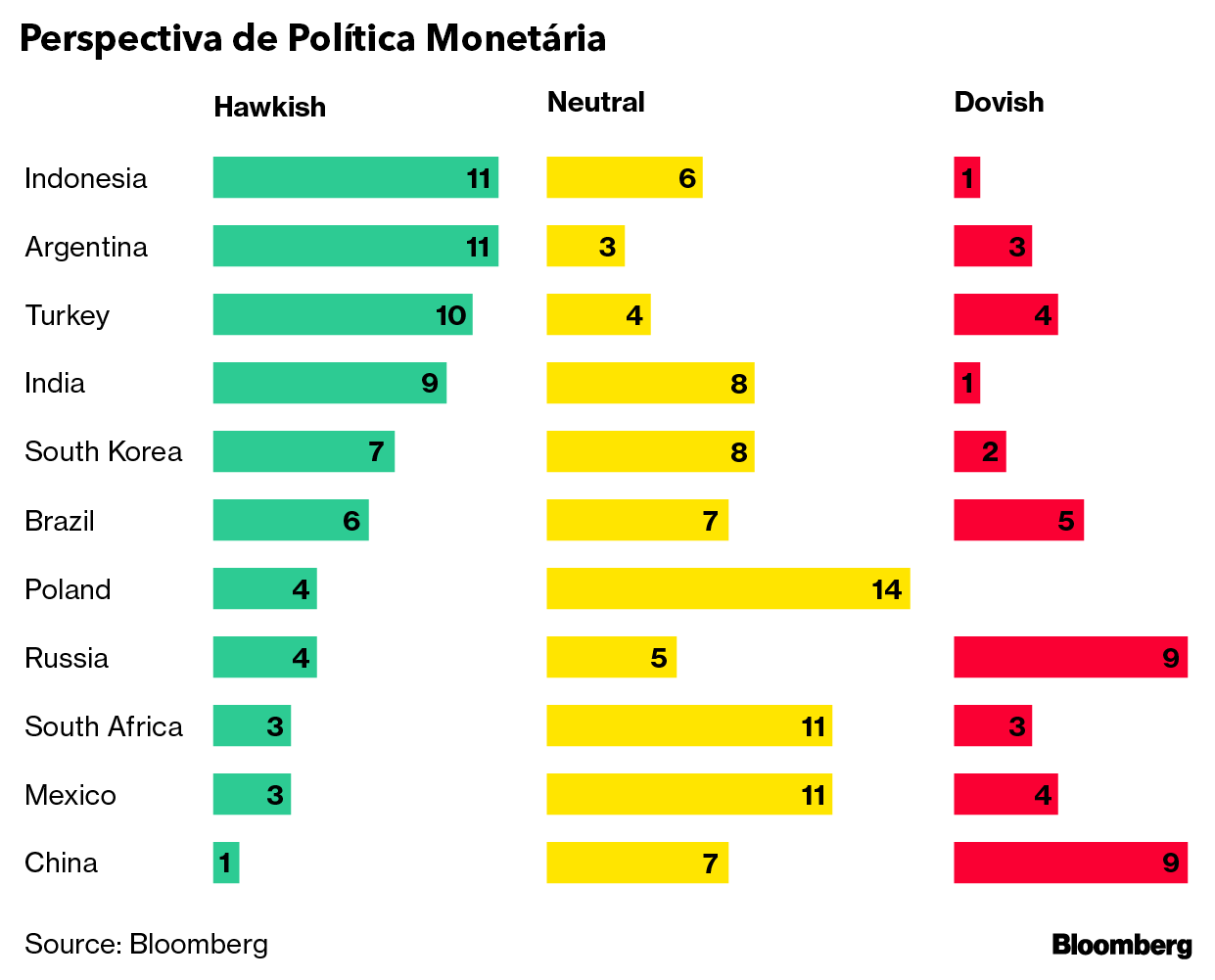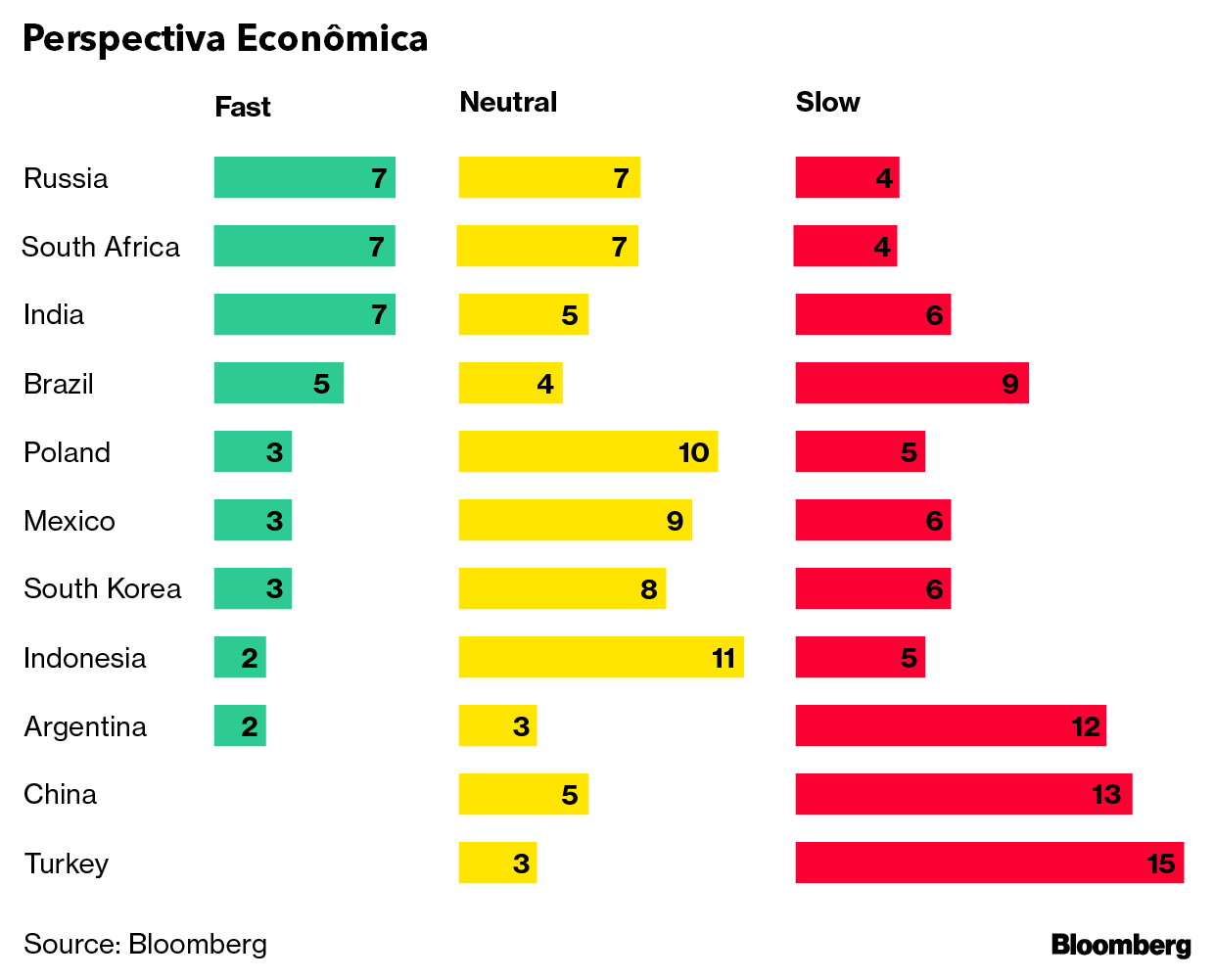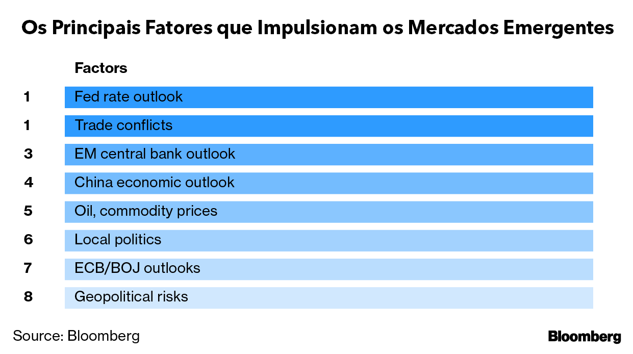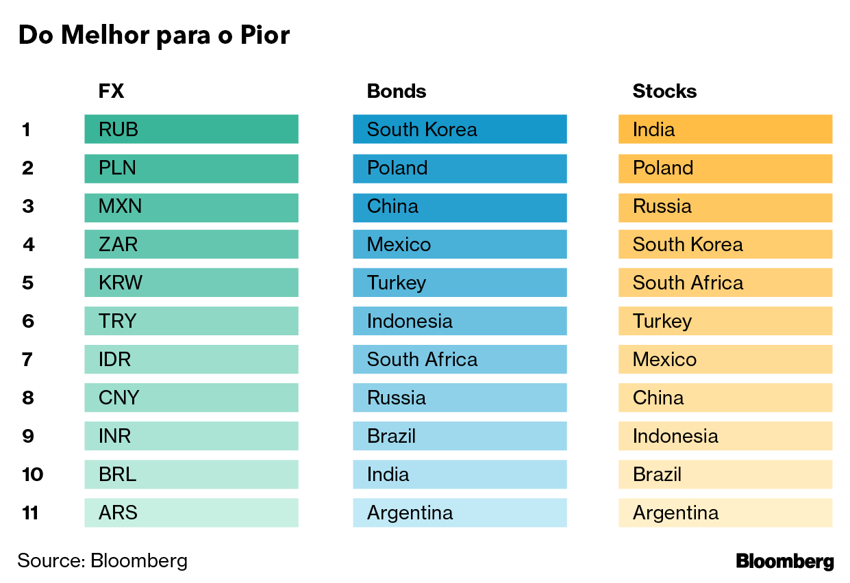 A pesquisa solicitou que os entrevistados colocassem em ordem os vetores de maior peso nos mercados em desenvolvimento no segundo semestre. Eles listaram a moeda da Rússia, títulos da Coreia do Sul, ações da Índia, além de ações, títulos e a moeda da Polônia. No pé da lista em todas as classes de ativos está a Argentina, que subiu a taxa básica de juros para 40 por cento para defender o peso.