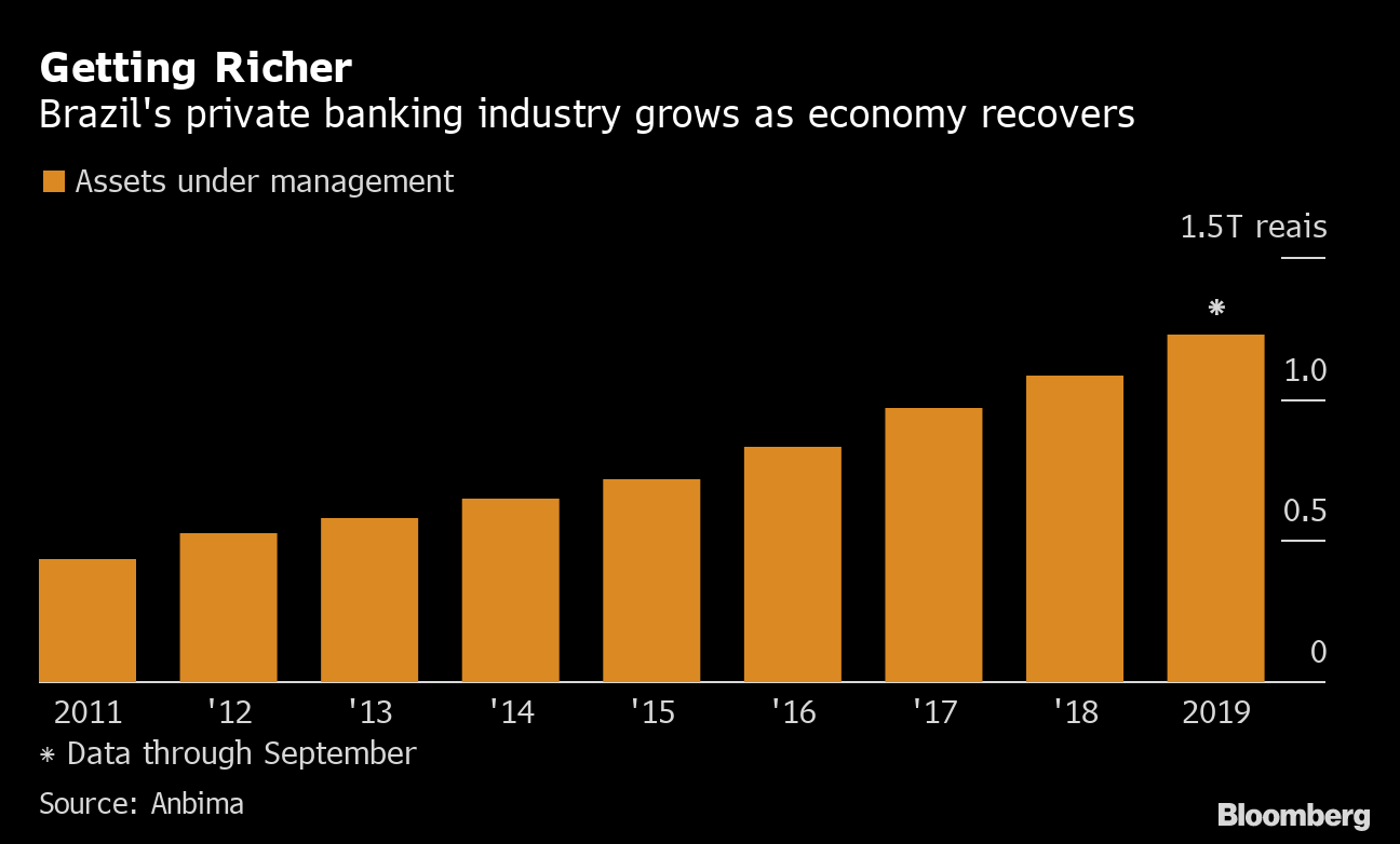 O total de fortunas sob gestão no mercado local do Brasil atingiu R$ 1,2 trilhão em setembro, 13% a mais do que em dezembro de 2018, segundo a Anbima, a associação do mercado de capitais. Os empréstimos a clientes ricos saltaram 6,8%, para R$ 37,5 bilhões.