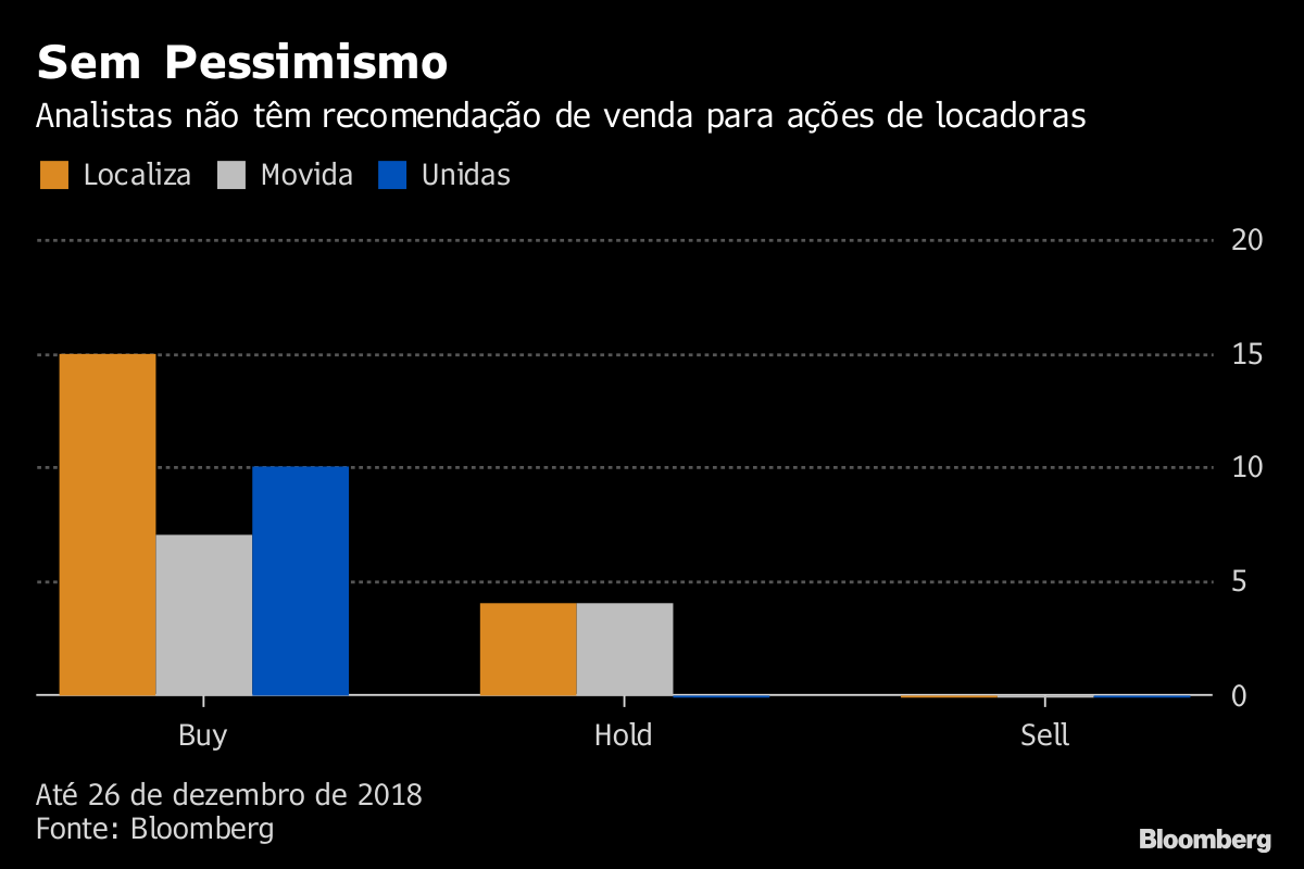 As ações de Localiza, Movida e Unidas acumulam ganhos de 31%, 19% e 85% em 2018, respectivamente, enquanto o Ibovespa registrou um avanço de 11% no mesmo período. Nenhuma das três tem recomendações de venda e os analistas vêem um potencial de ganho entre 5% e 22% para as empresas nos próximos 12 meses, segundo dados compilados pela Bloomberg.