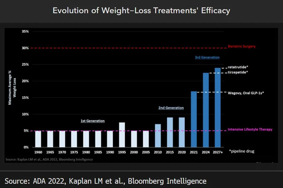 As vendas mundiais de medicamentos antiobesidade podem atingir US$ 44 bilhões em 2030, em comparação com US$ 2,5 bilhões em 2022, com os gigantes da indústria farmacêutica Novo Nordisk e Eli Lilly liderando o ritmo. Essa estimativa da Bloomberg Intelligence foi baseada em medicamentos já no mercado e em ensaios clínicos de fase 3, e assume uma taxa conservadora de penetração no mercado dos EUA de 5% até 2030. Medicamentos em estágio inicial geraram dados promissores desde então, deixando a porta aberta para que essa cifra atinja até US$ 60-70 bilhões, segundo o analista Michael Shah, excluindo o potencial total de vendas na China.