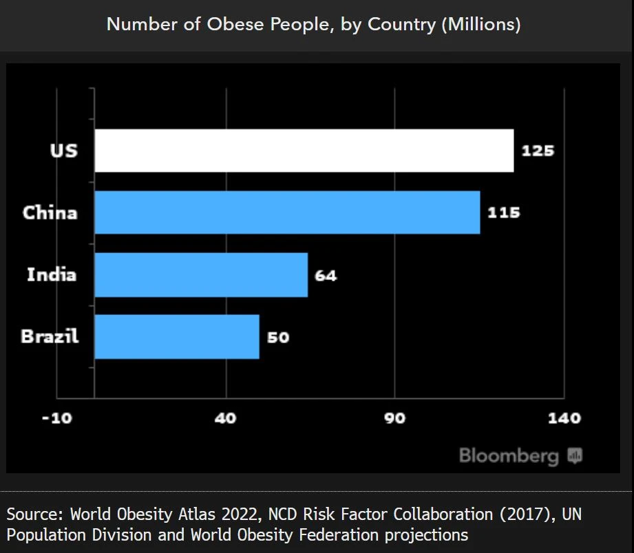A obesidade, definida como ter um índice de massa corporal (IMC) de 30 ou mais, poderia afetar 115 milhões de adultos na China até 2030, pouco atrás dos Estados Unidos. Os preços de venda de medicamentos para perda de peso ou antiobesidade na China provavelmente serão substancialmente mais baixos do que nos EUA. Embora não seja uma comparação direta, o liraglutide da Huadong Medicine — uma versão genérica do Saxenda da Novo — custa aproximadamente US$ 1.600 por ano na China, menos de um décimo do custo bruto anual de US$ 17.500 do Wegovy da Novo nos EUA.
