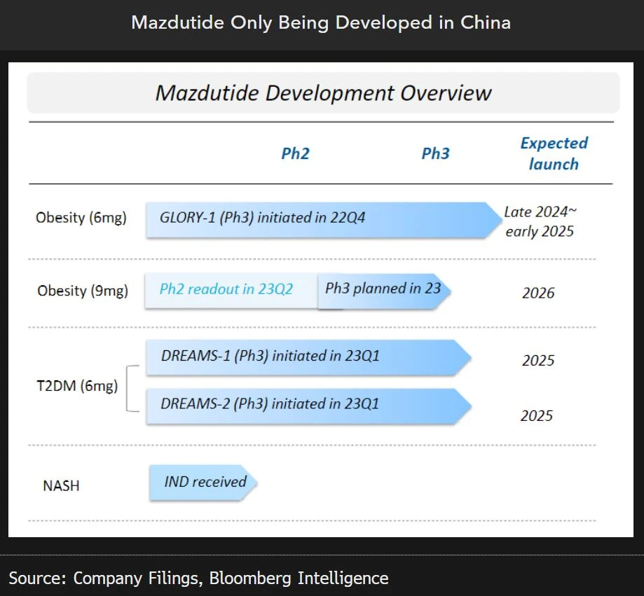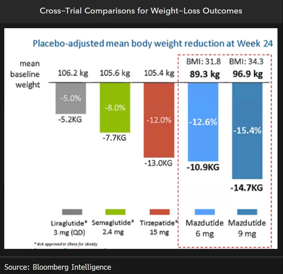 A Innovent poderia iniciar os ensaios de fase 3 para o mazdutide de 9 mg no segundo semestre e para o mazdutide de 6 mg para obesidade até o primeiro semestre de 2024, com o respaldo de dados positivos. Até o momento, o liraglutide da Huadong e o beinaglutide da Benemae são os primeiros GLP-1s aprovados para obesidade na China, e uma decisão está pendente para o Wegovy. No entanto, ao contrário da dosagem semanal conveniente do Wegovy ou do mazdutide, o liraglutide é administrado uma vez ao dia e o beinaglutide três vezes ao dia.