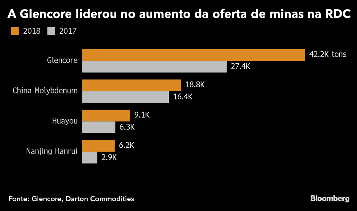 A Glencore, maior produtora de cobalto, ampliou essa liderança em 2018 com uma grande expansão de suas minas do Congo. As mineradoras chinesas também ampliaram a produção para alimentar a demanda crescente das fabricantes de baterias.