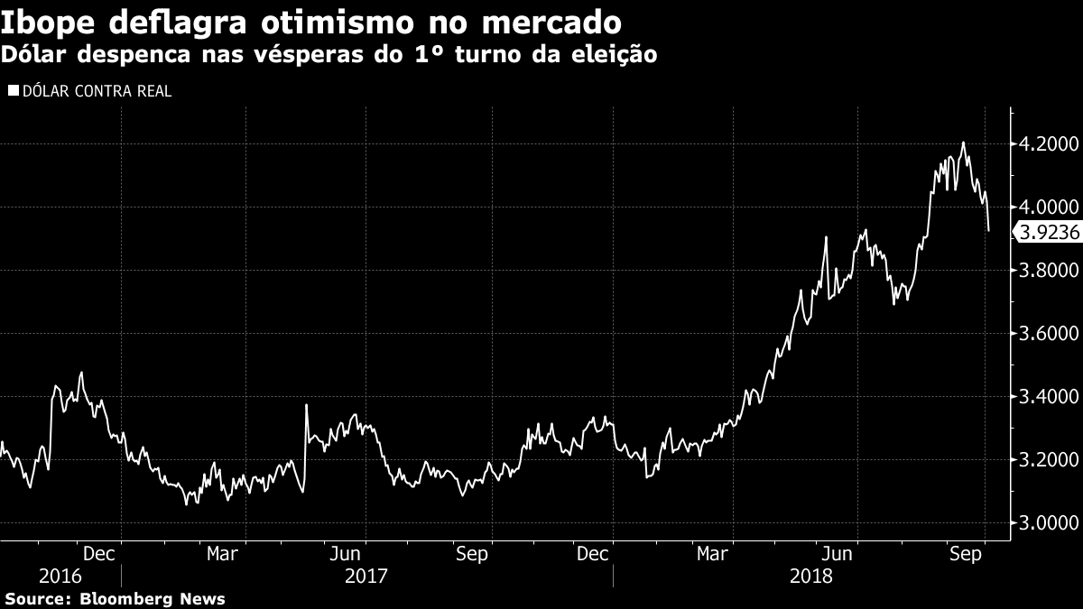 Nesta terça-feira, em reação ao Ibope, o dólar cai mais de 2%, no patamar de R$ 3,92, rumo à maior queda desde junho em termos de fechamento. A bolsa sobe 4%, acima de 81.000 pontos, a caminho de encerrar o dia na maior alta desde maio de 2016.