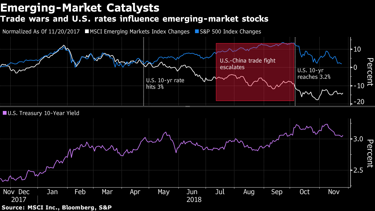 A redução nas tensões comerciais de investimentos entre os EUA e a China pode ser particularmente útil depois que a escalada nos meses intermediários de 2018, e a consequente queda do yuan chinês, causaram um duro impacto no MSCI Emerging Market Index. Os presidentes Xi Jinping e Donald Trump devem se reunir em Buenos Aires no fim da semana, um mês antes do próximo aumento programado das tarifas do comércio bilateral.