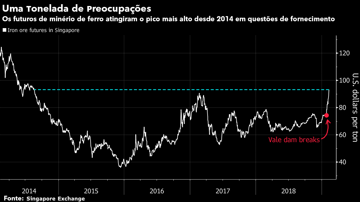 Futuros de minério subiram mais de 5% para nível mais alto desde 2014 sob a preocupação de que a crise cada vez mais severa da Vale reduzirá o fornecimento global, trazendo condições mais apertadas ao mercado transoceânico e compensando o impacto de uma desaceleração na China, o maior importador.