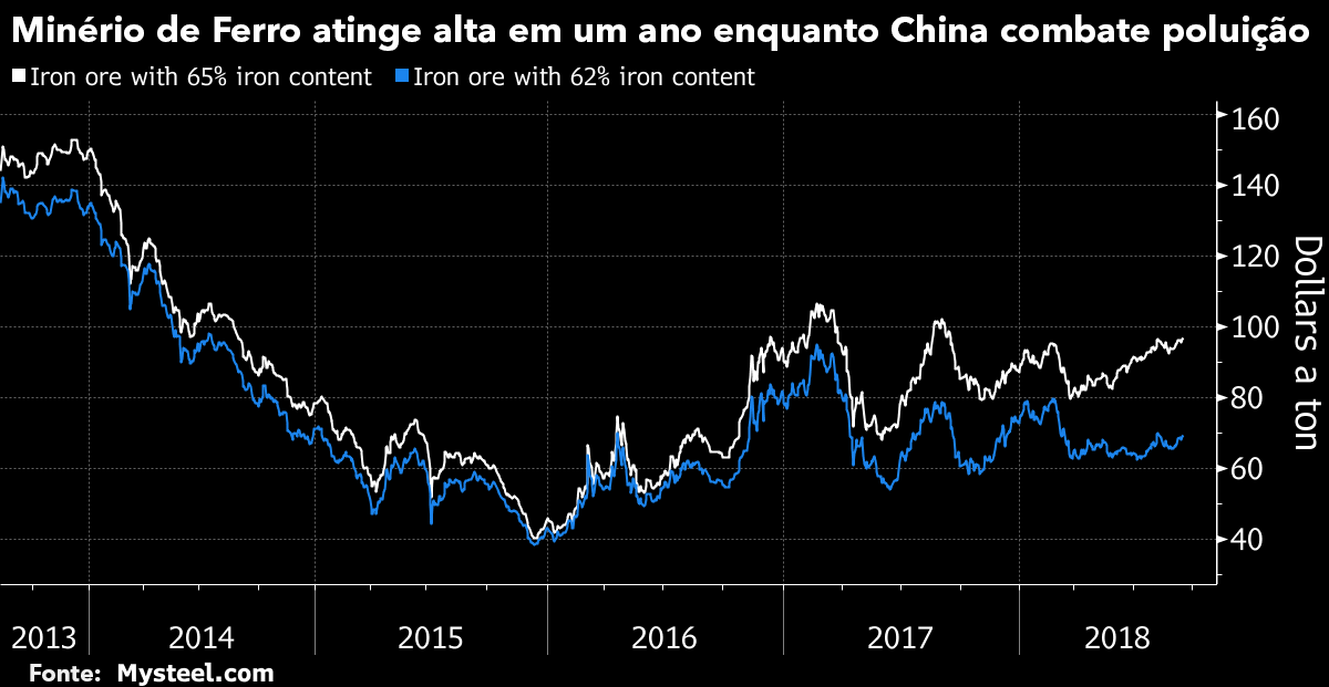 O minério de ferro de alta qualidade teve uma forte alta e seu preço atingiu o maior patamar em um ano em meio à intensificação do combate à poluição na China. O rali oferece uma recompensa para mineradoras como a brasileira Vale e contrasta com os prejuízos de outras matérias-primas devido à guerra comercial entre EUA e China.