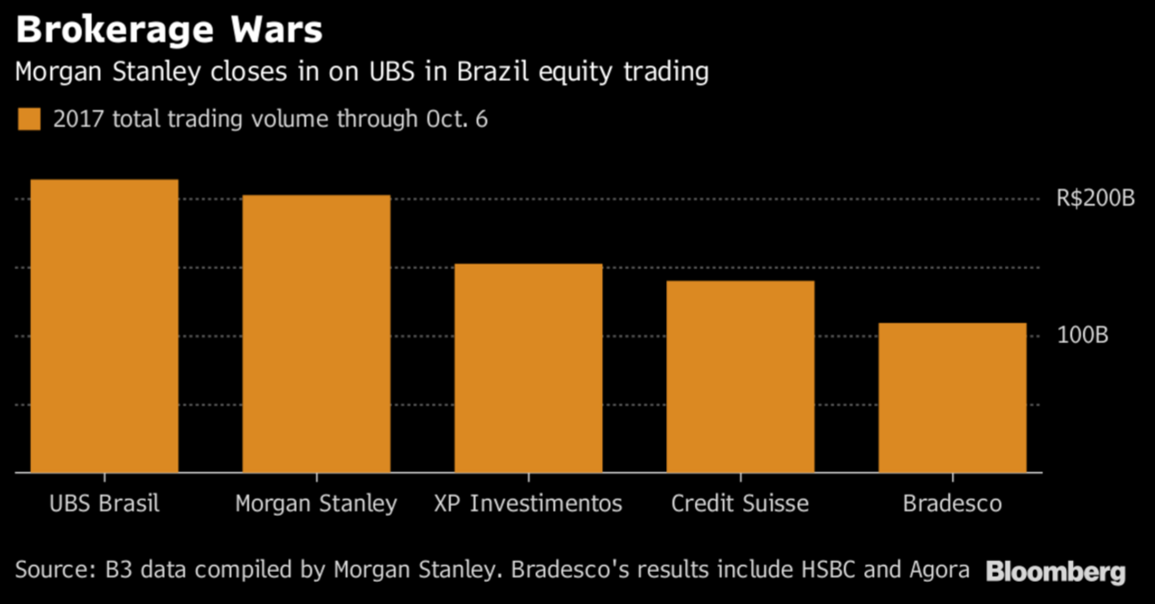 O Morgan Stanley, primeiro em trading de ações no ranking mundial, aumentou participação nesse nicho no Brasil de 11% nos primeiros três trimestres do ano passado para 12,8% neste ano até 6 de outubro. Em 2013, a fatia era de 7,7%. A diferença em relação ao líder UBS passou de 3,7 pontos percentuais em 2016 para 0,8 ponto percentual.