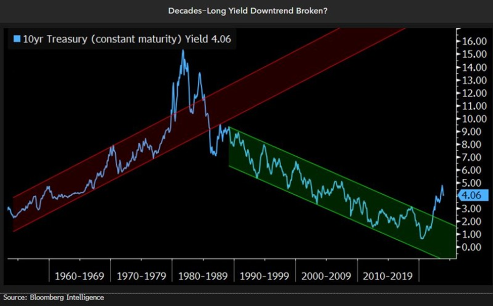 Com a tendência de baixa de quatro décadas nos rendimentos definitivamente rompida, um novo paradigma para o Tesouro pode estar começando. Na próxima década (ou mais), vemos duas possibilidades realistas. Primeiro, o mercado poderia começar uma tendência de rendimentos mais altos, assim como ocorreu desde o fim da década de 1950 até o início da década de 1980. Entretanto, este período foi uma anomalia histórica (veja a próxima figura).