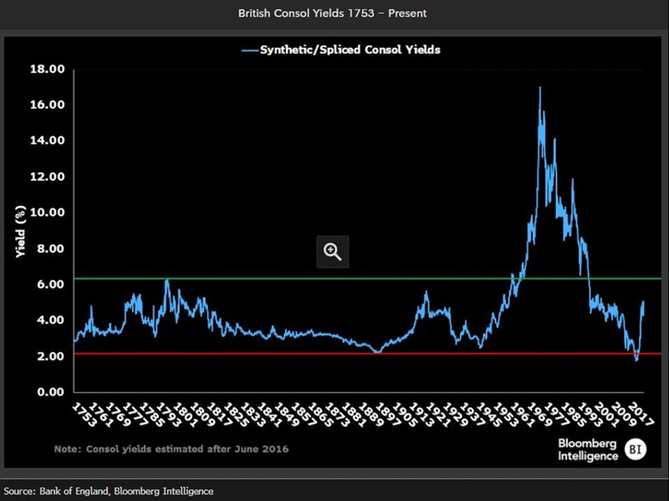 Durante séculos, a libra britânica foi a moeda de reserva mundial e a dívida pública relacionada fornecia a taxa de juros de referência. A partir de meados da década de 1700, excluindo os períodos de crise do petróleo na década de 1970, a faixa para as taxas de juros de longo prazo foi de cerca de 2,25% a 6,3%.