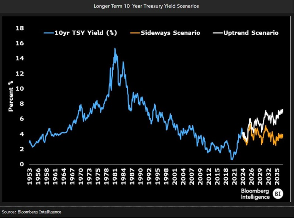 No entanto, uma reversão da tendência de quatro décadas não está fora de cogitação. Déficits que permanecem altos, retornos reais que aumentam se o mercado de trabalho permanecer extremamente apertado, choques exógenos (como guerras, picos de petróleo) e produtividade mais baixa podem contribuir para retornos mais altos ao longo do tempo. Ainda haverá movimentos cíclicos das taxas à medida que os ciclos econômicos mudarem, mas neste cenário, a tendência majoritária do rendimento é de alta.