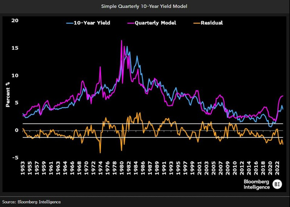 Os fundamentos não mudaram muito em termos de como o mercado precificará os rendimentos dos títulos de longo prazo, mas há duas mudanças muito importantes que alguns modelos simples não estão observando. A primeira, que abordamos anteriormente (veja o link à esquerda) é a dinâmica da dívida. O estoque da dívida muito maior atualmente em comparação com décadas passadas pode manter os rendimentos mais elevados do que seriam de outra forma — mas os rendimentos não são baratos frente ao valor justo, mesmo diante dessa mudança. Mais relevante, em nossa opinião, é a propensão do mercado de precificar rendimentos reais mais baixos do que os que existiam com base em dados históricos.