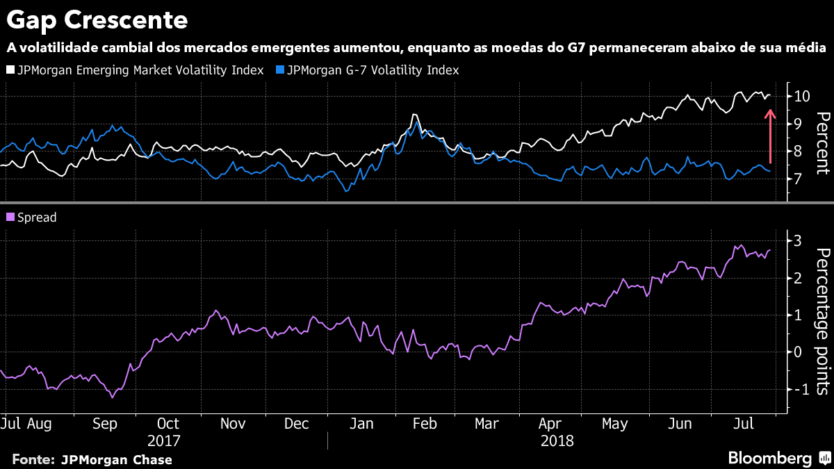 O índice JPMorgan de volatilidade cambial de mercados emergentes caiu para 7,45% em janeiro. Ele subiu para 10,14 este mês, o maior desde fevereiro de 2017 e ligeiramente acima da média de cinco anos de cerca de 9,36. Em contraste, a medida do JPMorgan para as moedas do G-7 caiu para 6,98% no início de julho.