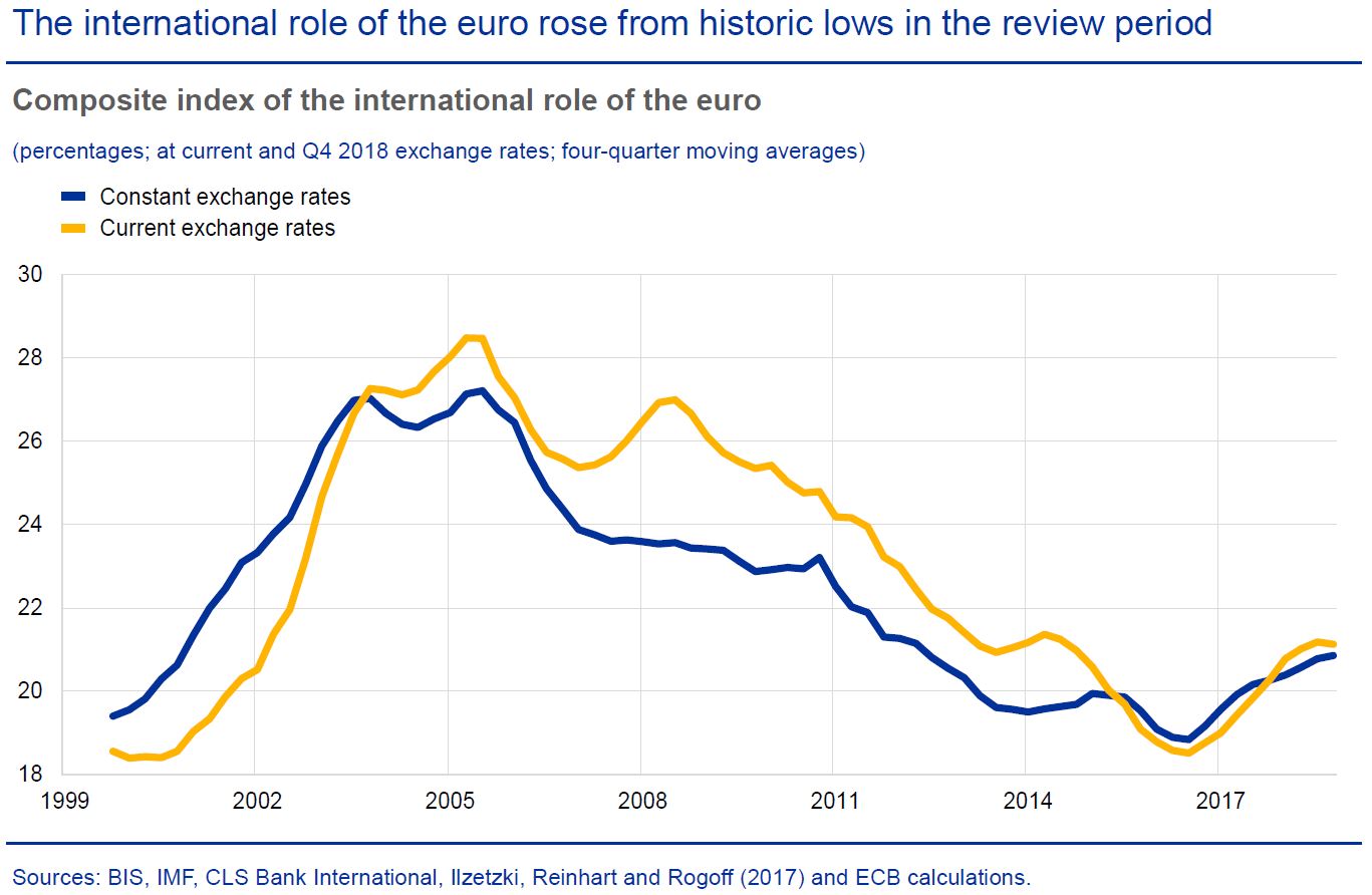 “A turbulência financeira em algumas economias emergentes, as preocupações crescentes sobre o impacto das tensões no comércio internacional e os desafios ao multilateralismo, como a imposição de sanções unilaterais, parecem ter dado suporte à posição global do euro”, afirma o relatório.