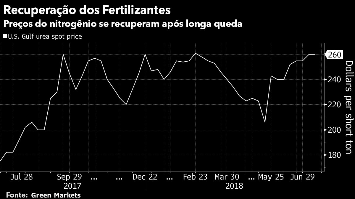 Os preços da soja despencaram desde maio, quando a oleaginosa se viu em meio ao fogo cruzado da disputa que levou a China a aplicar impostos aos produtos agrícolas americanos. O colapso provavelmente levará os produtores dos EUA em 2019 a trocar hectares de soja por milho, um grande usuário de fertilizante nitrogenado, disse Jonas Oxgaard, analista da Sanford C. Bernstein, em Nova York.